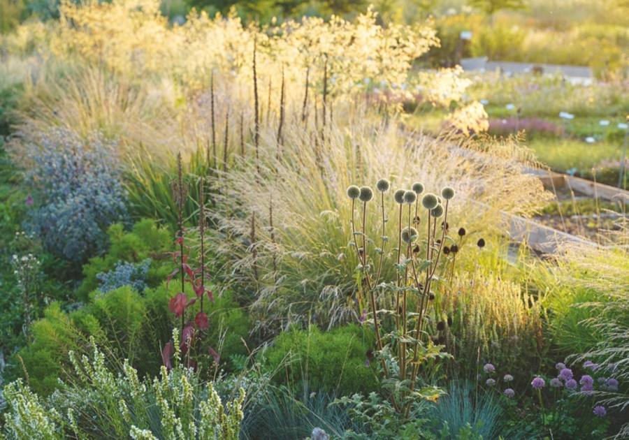 Echinops niveus davanti a Poa labillardieri, infruttescenze di Verbascum chaixii, sfondo Stipa gigantea Foto: Till Hofmann