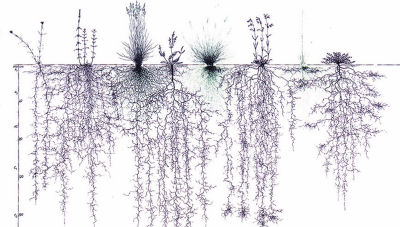 I giardinieri e ancor di più i loro clienti sono abituati a valutare le porzioni fuori terra delle piante. La qualità delle piante è spesso identificata con germogli forti, fogliame denso, forse molti fiori. Le radici sono meno interessanti, alcune persone controlleranno se la zolla radicale è solida. Non deve essere troppo grande, altrimenti la movimentazione durante il trasporto e la piantagione diventerà più difficile. Piante attraenti ma “con chioma pesante (voluminosa)” vengono piantate regolarmente nei giardini, e devono essere annaffiate intensamente nel corso degli anni per continuare a prosperare lì come fanno nel vivaio. Nel loro habitat naturale, le stesse specie hanno apparati radicali completamente diversi e molto più profondi. Soprattutto per le piante in luoghi secchi d’estate, la radice profonda è la questione centrale della sopravvivenza. Gli organi superficiali sono molto più piccoli in proporzione rispetto alle piante da giardino, il cui rapporto di “sopra” e “sotto”, quando conta, è più sfavorevole.