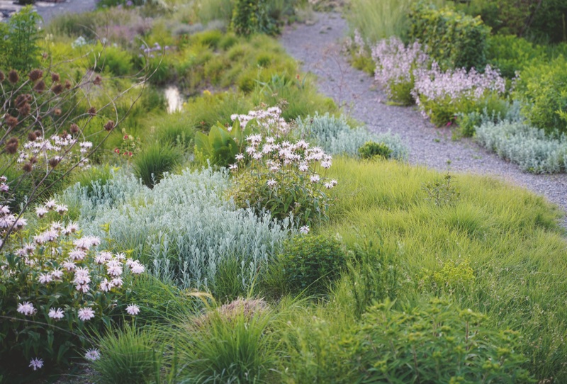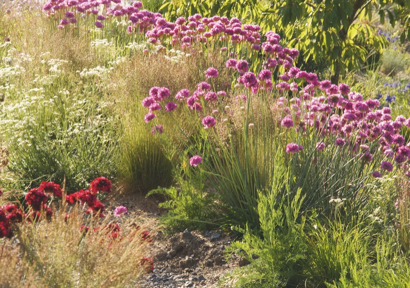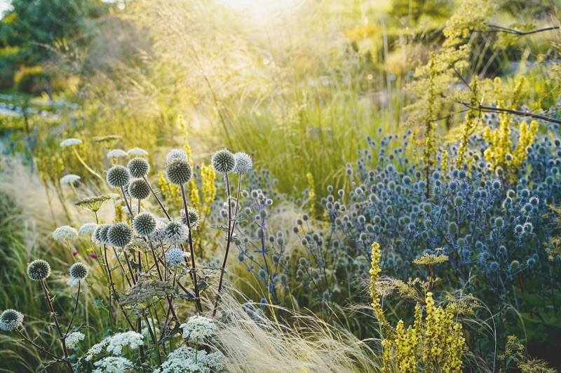 Umore mattutino in piena estate: Echinops niveus, Eryngium planum, Ligusticum lucidum, Stipa splendens, Verbascum chaixii. Foto: Til Hofmann