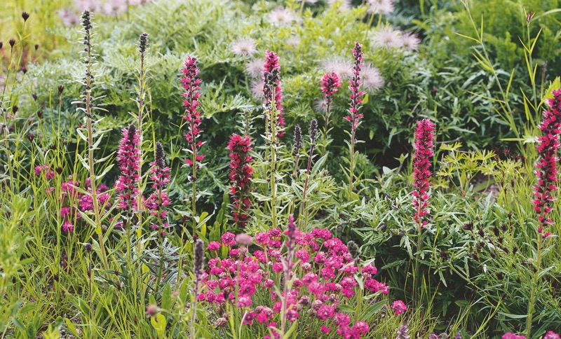 L’Echium russicum simile a una candela ama i luoghi aperti e caldi e ha bisogno di spazio per autoseminarsi In primo piano: Armeria maritima Foto: Till Hofmann