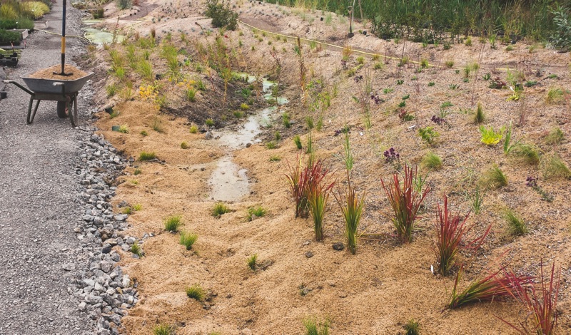 Le aree pacciamate con minerali sono solitamente aree che sono state ripulite, qui la nuova piantagione di un prato semi-asciutto costituito da piante perenni selvatiche autoctone. Foto: Til Hofmann