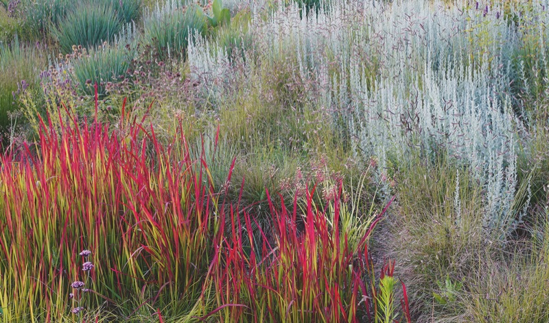 Cambio di collocazione in uno spazio molto ristretto: Imperata cylidrica ‘Red Baron’ nel fosso asciutto, Artemisia ludoviciana ‘Silver Carpet’ con Bouteloua gracilis nel secco e caldo terrapieno Foto: Til Hofmann